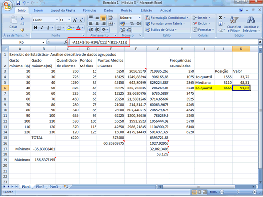 | O segundo passo será determinar os valores efetivos dos quartis a partir da formulação já discutida anteriormente e reapresentada no passo anterior. Na célula K4, para o primeiro quartil, deve-se digitar =A5+(((J4-H4)/C5)*(B5-A5)), pois na célula A5 está o limite inferior da classe à qual pertence o quartil, em J4 está a posição do quartil, em H4 a frequência acumulada até a classe anterior a do quartil, em C5 está a frequência da classe na qual está o quartil, e a operação B5-A5 gera a amplitude da classe na qual está o quartil. O procedimento para a mediana e terceiro quartis, apresentados nas células K5 e K6, respectivamente, é análogo.