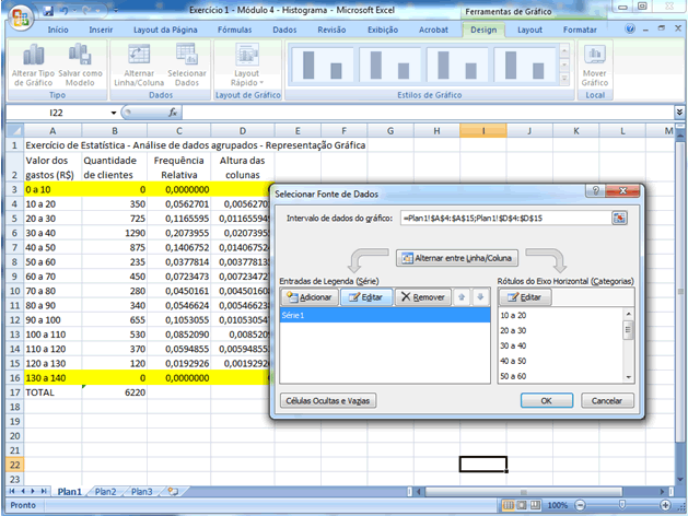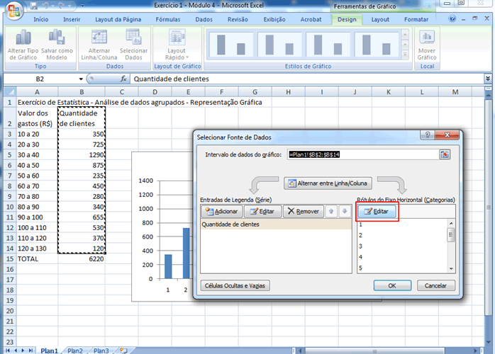 | Vamos ajustar o gráfico para considerar essas duas novas classes. Iremos clicar no gráfico, logo em seguida, na guia Design, iremos clicar em "selecionar dados". Na caixa de diálogo selecionar "Série1" e clique em Editar, como mostra a figura a seguir.