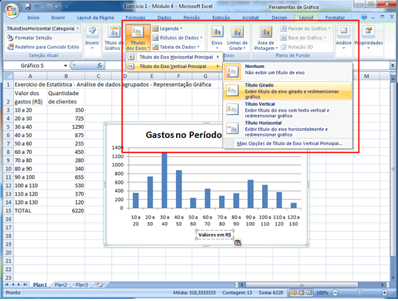 | Vamos agora repetir o procedimento para o eixo vertical, clicando no botão "Títulos dos Eixos", em "Título do Eixo Vertical Principal" e na opção "Título Girado":