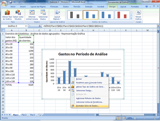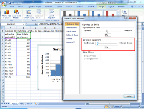 Como há um senso de continuidade para a variável que se está estudando (Despesas/gastos realizados), em particular na transição de uma classe de gastos para outra, pode-se alargar as colunas de forma que elas fiquem "coladas" umas às outras. Isso será feito clicando uma vez sobre uma das barras do gráfico, e com o botão direito do mouse escolhendo a opção "Formatar Série de Dados".