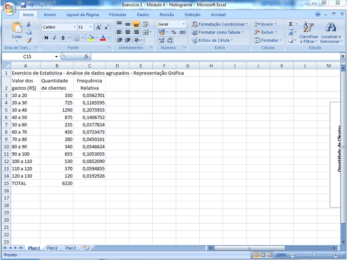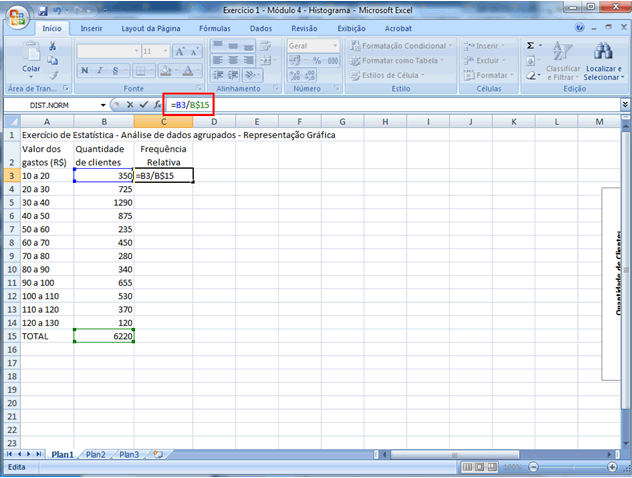 | 2 - Desenhando um histograma e um polígono de frequências Uma adaptação interessante no gráfico apresentado nessa última tela seria fazer com que a área total das colunas correspondesse à frequência total, ou seja, 100% = 1. Assim a área de cada coluna corresponderia à frequência relativa daquela classe. Para tanto vamos criar uma coluna chamada de "Frequência Relativa". A frequência relativa é dada pela quantidade de clientes na classe/dividido pela quantidade total de clientes. No caso da primeira classe seria B3/B$15 (Lembre-se de que o símbolo $ em uma fórmula serve para “travar” a célula B15, de forma que se arrastarmos a fórmula para baixo ela continue dividindo as células por B15).