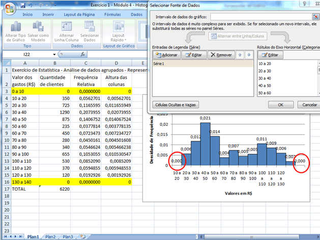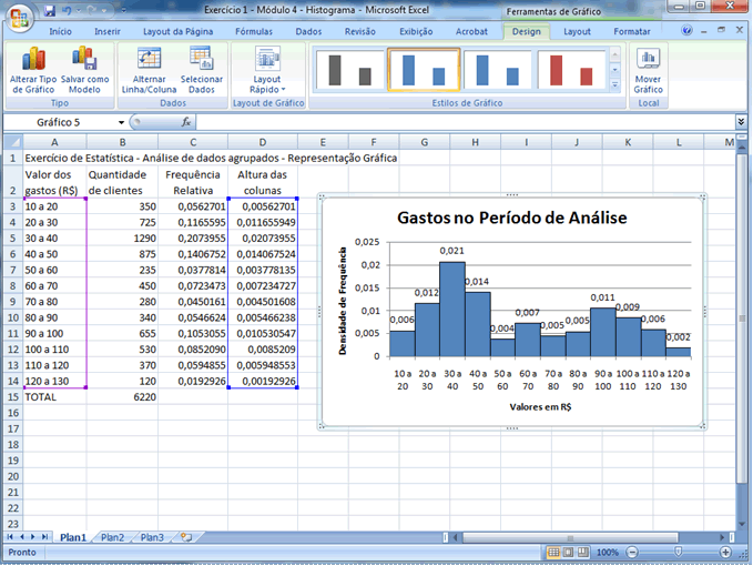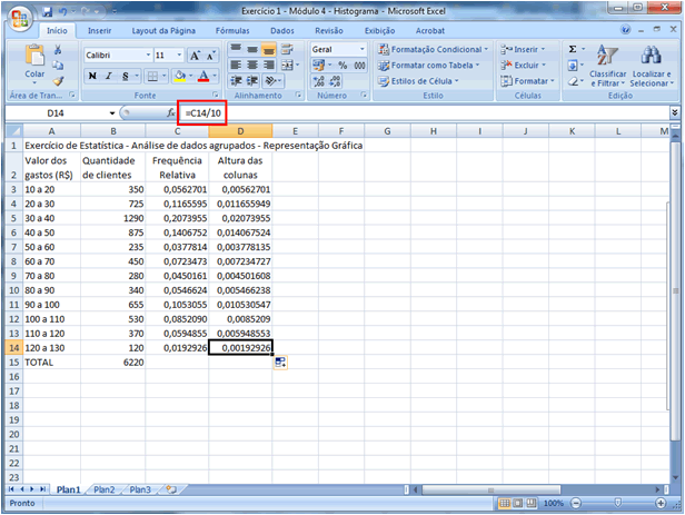 | Vamos agora calcular a altura das colunas. Para que a área total sob o gráfico seja 1, a altura das colunas será dada pela frequência relativa dividida pela amplitude da classe. Sabe-se que para todas as classes a amplitude é 10 (isso é, todas as bases são iguais a 10). Incluiremos então uma nova coluna chamada "Altura das colunas", como segue: