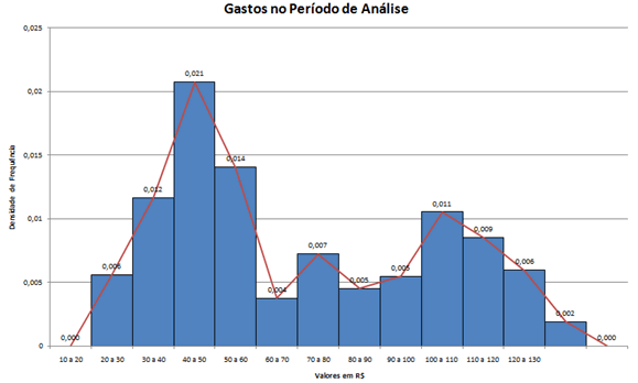 | A primeira premissa diz respeito aos valores das despesas: assume-se, por hipótese, que os dados de cada classe estejam uniformemente distribuídos ao longo dos intervalos, o que significa dizer que, supostamente, os 350 clientes do primeiro intervalo estariam distribuídos de forma "equilibrada" entre os diversos valores entre 10 e 20 reais, o mesmo valendo para os 725 do segundo intervalo e assim sucessivamente. Sendo assim, a despesa média para cada intervalo passa a ser o próprio ponto médio do respectivo intervalo, sendo esse o ponto que mais se aproximaria (provocaria menor erro) do conjunto das despesas inseridas em cada intervalo. É claro que a questão da largura do intervalo passa a ter uma expressiva relevância, pois quanto maior sua amplitude, maior nossa "ignorância" a respeito dos dados ali inseridos e, consequentemente, menor a precisão das medidas que se pretende calcular. À medida que a largura dos intervalos aumenta, se por um lado a precisão diminui, a síntese/o resumo na apresentação dos dados aumenta. E, como não é possível dissociar um fato do outro, o que se busca é um equilíbrio entre perda/ganho de precisão e ganho/perda de síntese. Não há uma formulação "mágica" que assegure configurações ótimas nesse sentido (embora alguns textos apresentem fórmulas, como a de Sturges, que buscam esse objetivo, ao estabelecer um número de classes a partir de uma estrutura que utiliza a função logarítmica e o total de indivíduos/objetos estudados). Recomenda-se bom senso, tendo-se em mente que um bom sinalizador de que o equilíbrio ainda não foi alcançado é quando uma (ou mais classes) apresentam frequências julgadas muito superiores ou muito inferiores à maioria das demais. Por exemplo, se uma