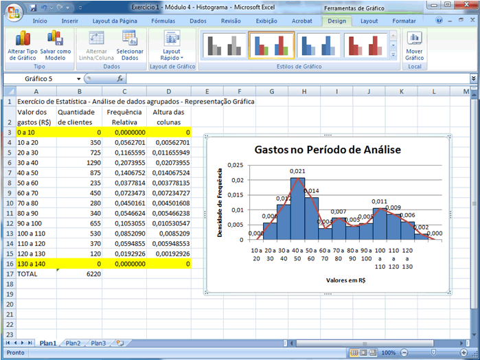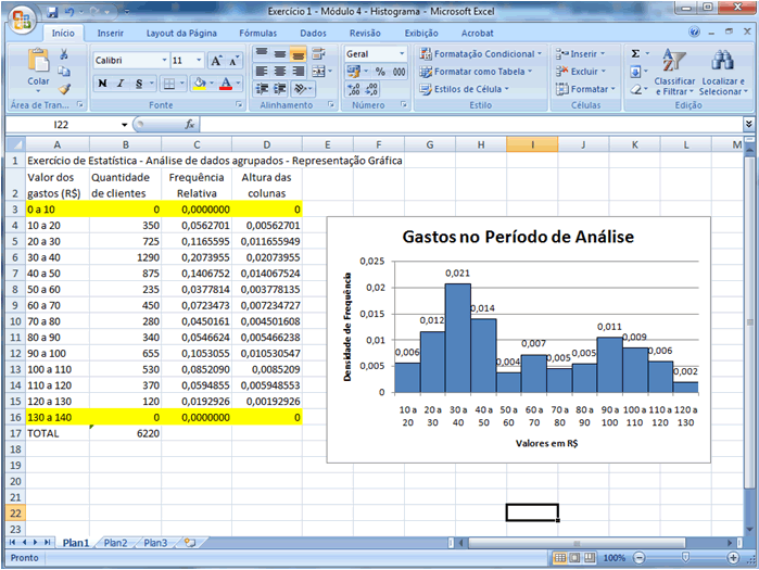 | Vamos elaborar na prática para que isso se torne mais claro. Utilizaremos como base a planilha anterior, mas inseriremos uma classe à esquerda da menor classe e uma à direita da maior classe. Como a amplitude de todas as classes do exemplo é 10, então iremos criar uma nova classe de gastos de 0 a 10 com quantidade de clientes 0 e outra de 130 a 140 com a quantidade de clientes zero. Para isso, insira as duas novas linhas na planilha e inclua os valores indicados: