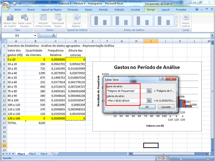 | Altere os valores da série para considerar também as duas novas alturas de coluna (B3 a B16) e clique ENTER e OK.