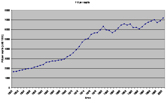 Isto dá ideia de riqueza independente do tamanho da população, pois quando se divide todo o PIB pela população, atribui-se uma mesma fatia da produção do país por cabeça de habitante. Desse modo, temos uma medida de produto individual para qualquer país do mundo, ou medida da renda média por pessoa. Portanto, o adequado é compararmos o PIB per capita entre as nações. Por exemplo, na tabela abaixo, apresentamos o PIB per capita da economia brasileira, em valores reais de 1990, para o período de 1950 a 2000. Notamos que até 1980 a economia apresentava taxas significativas de crescimento, mas depois de 1980 a taxa de crescimento diminuiu substancialmente. A taxa de crescimento denota a diferença entre cada ponto do tempo em relação ao ponto inicial. PIB per capita, US$ 1990, 1950-2000