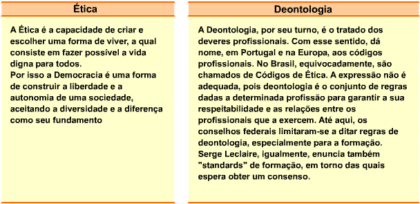 Qual a distinção entre Ética e Moral? Estas palavras referem-se a um tipo de comportamento que não é natural, mas é adquirido por hábito. Os dois termos – Ética e Moral – referem-se a uma realidade humana, construída histórica e socialmente, tendo por fundamento as relações coletivas dos seres humanos nas sociedades onde nascem e vivem. A Ética é a capacidade de criar e escolher uma forma de viver, que consiste em fazer possível a vida digna para todos. Por isso, a Democracia é uma forma de construir a liberdade e a autonomia de uma sociedade, aceitando como seu fundamento a diversidade e a diferença. A Deontologia, ou o estudo dos princípios, fundamentos e sistemas de moral, por seu turno, é o tratado dos deveres profissionais. Com esse sentido, dá nome, em Portugal e na Europa, aos códigos profissionais. No Brasil, equivocadamente, são chamados de Códigos de Ética. A expressão não é adequada, porque deontologia é o conjunto de regras dadas a uma profissão, para garantir a sua respeitabilidade e as relações entre os profissionais. Os Conselhos Federais limitam-se, ainda, a ditar regras de deontologia, especialmente para a formação. O ser humano, como ser moral e ético, apenas se realiza na vida social e comunitária. A vida do Homem é sempre compartilhada; disto decorre que, no campo das relações intersubjetivas, surgem os problemas e as indagações morais. O nosso cotidiano é, frequentemente, assaltado por problemas práticos e concretos, por situações que nos colocam diante de impasses e dilemas morais. Para efetuar escolhas, as quais pautam nossa conduta, nossas ações e nosso comportamento, para tomar a melhor decisão possível diante de problemas, quase sempre, complexos e intrincados, é necessário que saibamos bem avaliar para que nossas deliberações sejam adequadas e pertinazes. O que é necessário, então, para que isto ocorra? Como avaliar, julgar, deliberar, escolher e decidir da melhor maneira possível, diante das circunstâncias que se apresentam, e para todos os envolvidos? Acima de tudo, e em primeiríssimo lugar, necessitamos de critérios. Todas as nossas ações e decisões afetam as outras pessoas. Para que a convivência seja possível, criamos algumas regras que coordenam e harmonizam estas relações. Regra, régua, regulus, rex. A régua que estabelece os limites que devemos obedecer e as limitações às quais devemos nos submeter. Mas Ética é muito mais que obediência ou submissão. Cada grupo social e a sociedade como um todo criam regras para impor limites às condutas intersubjetivas. Essas regras são – literalmente – as réguas que usamos para medir o alcance das nossas possibilidades e a extensão das nossas limitações.