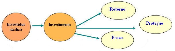 Todo investidor busca a otimização de três aspectos básicos em um investimento: retorno; prazo e proteção. Vejamos o diagrama que indica o que se deve avaliar em um investimento: