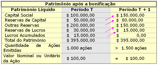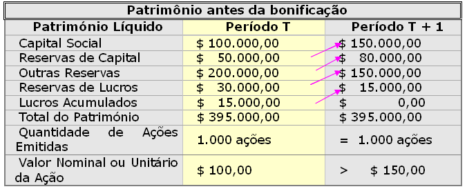 A modalidade de bonificação em ações advém do aumento de capital de uma sociedade, mediante a incorporação de reservas e lucros, quando são distribuídas gratuitamente novas ações a seus acionistas, em número proporcional às já possuídas. Excepcionalmente, além dos dividendos, uma empresa poderá conceder a seus acionistas uma participação adicional nos lucros, por meio de uma bonificação em dinheiro. Vejamos as tabelas comparando um patrimônio de empresa antes e depois da bonificação. |