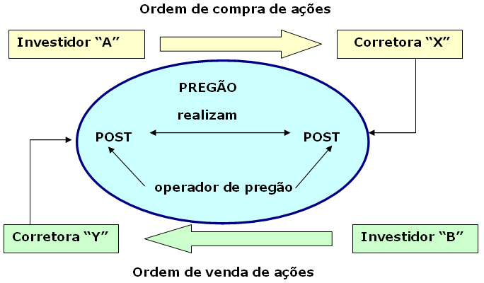 O funcionamento do mercado na bolsa envolve os investidores, as corretoras e os operadores de pregão conforme representa o diagrama a seguir.