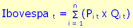 A apuração do IBOVESPA nada mais é do que o somatório dos pesos (a quantidade teórica da ação na carteira de mercado multiplicada pelo último preço daquela ação) das ações integrantes de sua carteira teórica, através da seguinte fórmula:
