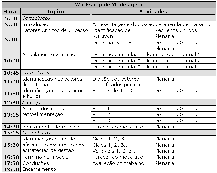 O grupo deve ser motivado a se concentrar em uma atividade nos primeiros 30 minutos, explicitando-se nesse tempo o que é o processo de modelagem e simulação e o que o grupo irá fazer. A utilização de modelos conceituais pode facilitar essa tarefa inicial