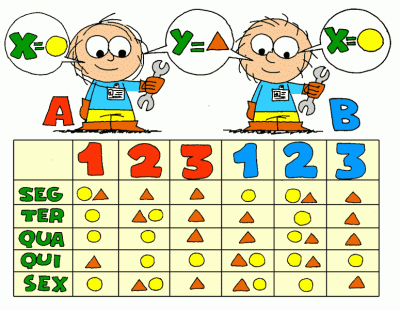É a análise de uma operação de montagem. A e B são operadores, cada um com três máquinas (1,2,3), observando dois tipos de defeito (X e Y), no período de cinco dias. Cumpre observar que o preenchimento deste tipo de tabela, feito com marcas, obedece a um código para cada tipo de defeito.