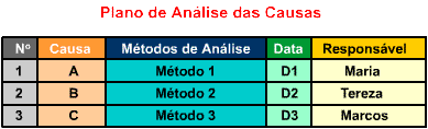 Ao terminar o diagrama, o grupo investiga cada uma das causas. Assim, o grupo determinará qual delas poderá ter influência sobre o efeito em estudo. As causas mais importantes serão assinaladas no diagrama. A seguir, o grupo prepara o Plano de Análise de Causas. Neste plano, são relacionadas as causas mais prováveis com a maneira de se verificar cada uma delas. O responsável pela coleta de dados tem o nome escrito no Plano. Às vezes, cumpre solicitar o auxilio de outras áreas da organização, o que será feito pelo chefe imediato do grupo.