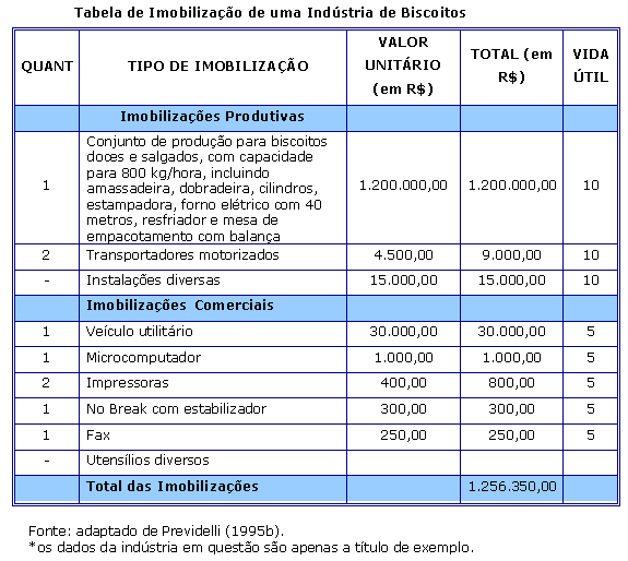 orçamento de capital do novo empreendimento. Em conjunto, aquisição e instalação compõem o investimento em bens produtivos (ou imobilização produtiva). Haverá, ainda, uma parcela do investimento destinada a mobiliário, computadores, telefones, enfim, uma parcela do investimento que atua em suporte ao processo operacional, mas que não está diretamente relacionada com ele, sendo denominada de imobilização comercial. Os recursos previstos no orçamento de capital são também chamados de “imobilizado”, pois constituem o ativo permanente da empresa. O orçamento de capital é muitas vezes denominado de tabela de imobilização. Estes itens possuem uma vida útil que deve ser estimada pelo empreendedor que, por sua vez, definirá sua taxa de depreciação. Veja um exemplo da tabela.