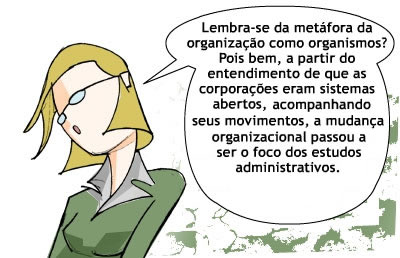 A maioria das metáforas que vimos até agora aborda a questão da mudança organizacional. As comparações remetem à necessidade de as corporações atentarem para as transformações ambientais internas e externas. Muito temos lido e ouvido sobre mudança organizacional, mas esse assunto, na verdade, não é algo tão novo assim. Em poucas décadas, na história ocidental, muitas mudanças ocorreram. Porém, é recente a preocupação em estudar esse fenômeno.