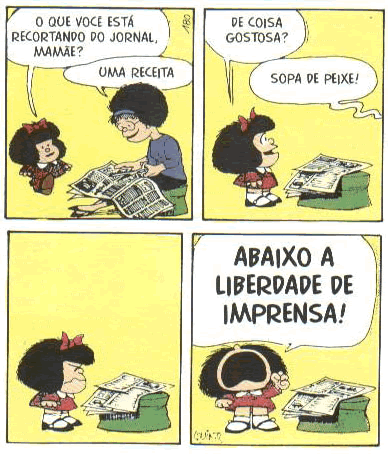Com essas informações, podemos perceber que a tira se torna ainda mais engraçada se considerarmos a reação exagerada de Mafalda ao “culpar” a liberdade de imprensa por uma eventual infelicidade no cardápio de casa. Provavelmente, uma criança comum iria resmungar, esboçar uma reclamação ou uma simples careta, demonstrando o seu desagrado, mas jamais evocaria a liberdade de imprensa. |