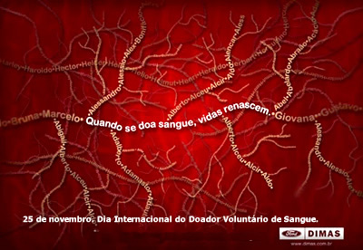 Do que se trata? Uma teia de artérias construída com inúmeros nomes de pessoas. Observe que, para reforçar esta imagem, foi utilizado o título “Quando se doa sangue, vidas renascem”. Eis o conceito da campanha criada pela Agência Decisão para o seu cliente Dimas (concessionária Ford e Hyundai) em homenagem ao Dia Internacional do Doador Voluntário de Sangue. É uma ideia importantíssima para a sociedade, além de propiciar uma “leitura” diferente com a proposta da imagem da teia de artérias com os nomes associados às vidas que necessitam de sangue. |