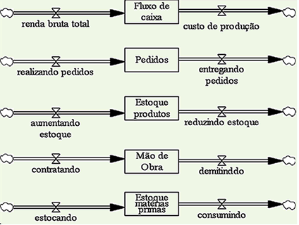 Técnica comparativa – Uma das melhores técnicas compreende escolher dois estoques do modelo (que tenham relacionamento entre si, embora não desenhado ainda) e solicitar ao grupo que dê um nome para essa comparação. É interessante perguntar, também, o que aconteceria se esses dois estoques estiverem desalinhados (Ex. Estoque de produtos prontos para entrega e Estoque de produtos em produção). Estas simples questões trazem naturalmente uma série de histórias que serão narradas pelos participantes e servirão de insumo para a construção dos ciclos de retroalimentação. A figura 4 mostra um modelo que pode ser muito útil, pois, tratando-se de um problema comum, os laços de feedback podem ser compreendidos naturalmente, sem explicação. Além disso, esse diagrama mostra os dilemas enfrentados pelas prefeituras das grandes cidades. Se forem construídas mais casas, isso atrairá ainda mais imigrantes, o que diminuirá os recursos da prefeitura para construir novas casas. Se as famílias são deixadas nas ruas, aumenta os problemas sociais e a necessidade de investir verbas para minimizá-los, o que diminui os recursos da prefeitura.