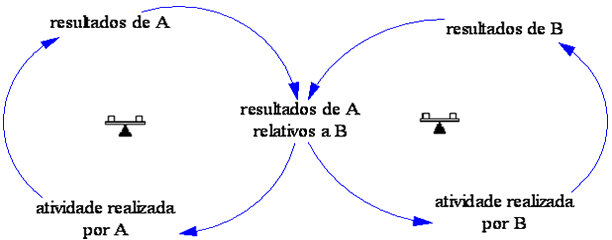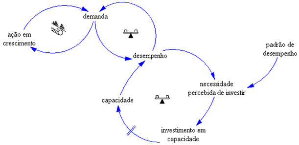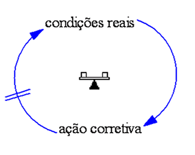 Estrutura de arquétipos – As estruturas de arquétipos são diagramas de ciclos causais, demonstrando padrões de comportamento organizacionais que podem ser de muita utilidade na construção das estruturas de feedback. Construídos por Peter Senge e publicados em seu livro A 5ª Disciplina, serão objeto de estudo no módulo 3 desta Unidade. 10 arquétipos foram construídos por Peter Senge e publicados em seu livro A 5ª Disciplina com ênfase aos feedbacks e defasagens comumente encontrados nas organizações, contudo, não detalham as causalidades entre as variáveis. Segue o resumo de cada arquétipo extraído do livro SENGE, Peter M. A Quinta Disciplina, São Paulo, SP Ed. Best Seller, 1998. 443p: I - Processo de Equilíbrio com Defasagem