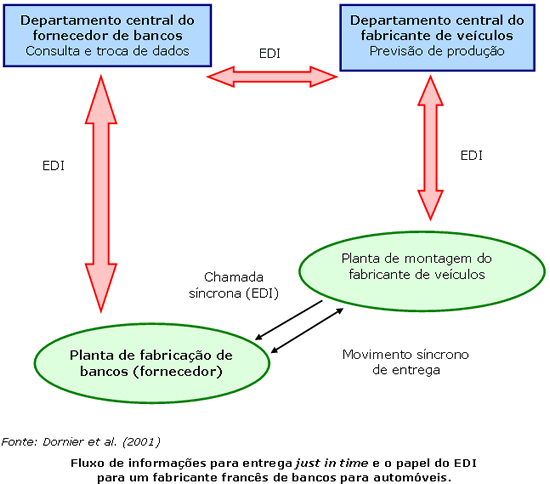 A evolução da Tecnologia da Informação (TI) nestes últimos anos possibilitou ampla modificação do modus operandi de diversas empresas. Com isso, criou-se um ambiente favorável para inovações na área da logística empresarial. O avanço da TI vem permitindo às empresas, operações que antes eram assunto apenas para imaginação. Atualmente existem diversas empresas que se beneficiam com a redução de custos e com ganho competitivo no mercado, empregando TI. Um exemplo particular do uso da TI é o intercâmbio eletrônico de dados – EDI, para melhorar não apenas a velocidade, mas também a acurácia da informação e diminuição de custos. O EDI não apenas torna possível transferir informações de um país para outro, mas permite também a transferência entre atores no mesmo setor, como entre setores, e capacita as empresas a manter contato direto (via computadores) com seus clientes e fornecedores, agilizando o fluxo de informações. O EDI proporcionou um relacionamento de confiança entre cliente e fornecedor de tal forma que os integrantes do mercado varejista, por exemplo, podem ficar tranqüilos quanto ao nível de estoque atingido em seus estabelecimentos comerciais, pois sabem que na hora exata o fornecedor será acionado com vistas à imediata reposição. O EDI e o sistema de telecomunicações é ferramenta importante na implantação bem sucedida da filosofia just-in-time em uma empresa. Dornier et al. (2000) apresenta a figura abaixo, que mostra a seqüência de informações da tecnologia EDI usada por um fabricante francês de bancos para automóveis que se utiliza just-in-time na produção e na entrega; nesse caso, o EDI tornou possível gerenciar a entrega de estoque ainda não alocado e transmitir instruções de entrega e faturas. Nessa fábrica, os pedidos são enviados a cada 50 segundos, e o intervalo de tempo entre a chegada do pedido e a colocação dos pedidos nos veículos é de apenas 10 minutos. O just-in-time será abordado na próxima unidade desse estudo (Unidade 2).