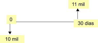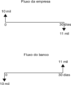 Uma empresa necessita de R$ 10 mil para pagar obrigações que vencem hoje, mas somente irá dispor deste volume de recursos daqui a 30 dias, quando deverá receber R$ 11 mil devido às vendas a prazo. |