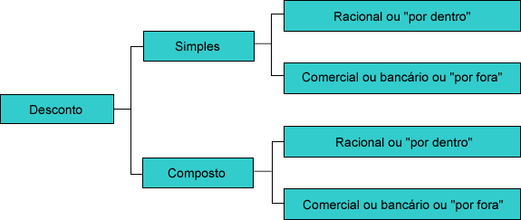 Conforme podemos verificar, as operações de desconto podem ser realizadas tanto com base no regime de juros simples como no de juros compostos, existindo dois tipos de desconto para cada um desses regimes: o desconto “por dentro”(ou racional) e o desconto “por fora” (bancário ou comercial). |