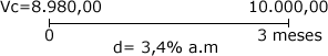 3) Uma empresa possui uma duplicata de valor nominal igual a R$ 10.000,00, vencível em três meses. Sabendo-se que a taxa de desconto simples (comercial) é de 3,4% ao mês, determine: a) o valor descontado e b) o valor do desconto.