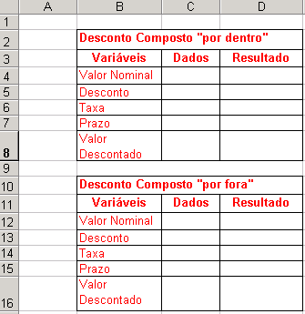 1. Abra uma pasta nova que depois poderá ser arquivada com o nome de Desconto Composto. PLANILHA DE CÁLCULO PARA DESCONTO COMPOSTO “POR DENTRO” 2. No intervalo B2 escreva: Desconto composto "por
