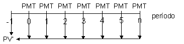 Como desejamos encontrar o valor presente da série hoje (momento 0), após aplicar a fórmula de valor presente para séries postecipadas, devemos capitalizar o resultado por um período, fazendo com que o valor encontrado no período “-1” (PV’) seja levado até o período “0” onde encontraremos PV, assim: