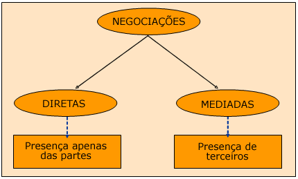 | 5 - Classificação quanto aos papéis dos participantes Em relação aos papéis dos participantes, as negociações se dividem em dois tipos: negociações diretas e negociações mediadas:
