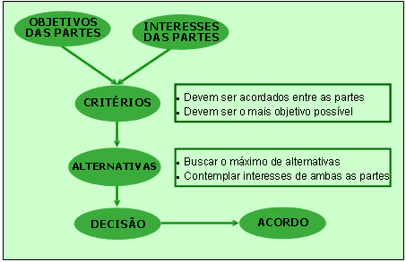Assim, o modelo processual decisório em negociações compreende a análise dos objetivos e dos interesses das partes, a partir de critérios racionais e de consenso entre as partes. Dessa análise, devem ser levantadas todas as alternativas possíveis de serem seguidas, para escolha de uma (ou algumas) delas, as quais devem ser explicadas no acordo. A figura abaixo ilustra o modelo de processo decisório em negociações.