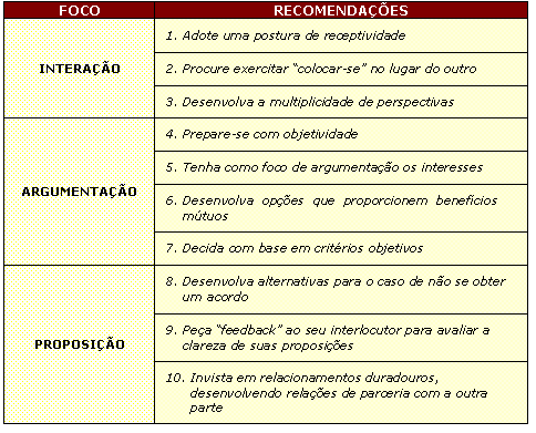 Ao apresentarmos recomendações, em função de áreas focais estreitamente vinculadas ao processo de negociação, queremos deixar claro que elas constituem um conjunto integrado e dinâmico. Portanto, dessa forma, estamos reforçando a necessidade estratégica de o negociador não se fixar em técnica específica, mas sim ao contexto da negociação.