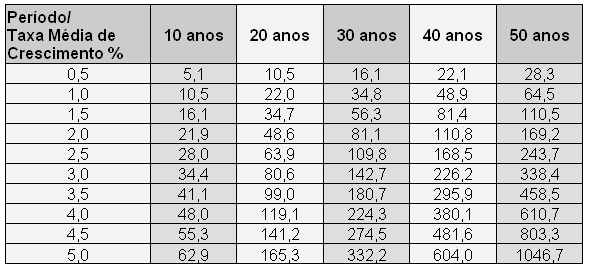Nesta tabela podemos observar que as taxas de crescimento quando parecem pequenas em termos percentuais tornam-se grandes quando compostas ao longo de muitos anos. Por exemplo: um crescimento médio de 0,5% ao ano, resulta em 50 anos em crescimento de 28.3%. Da mesma forma, se a taxa média de crescimento for de 1,5%, o resultado acumulado final será de 110,5% em 50 anos. |