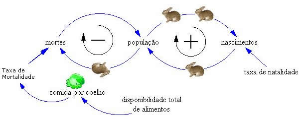 Agora, as duas coisas que determinam a quantidade de alimento para cada coelho são a disponibilidade de comida em uma área em particular e o número de coelhos na mesma área. Vamos assumir, inicialmente, que a quantidade de alimentos seja sempre a mesma. Temos agora um ciclo adicional de retroalimentação negativo: como o número de coelhos aumenta, a quantidade de comida disponível para cada coelho diminui. Como conseqüência, a taxa de mortalidade aumenta e a população de coelhos começa a diminuir. |