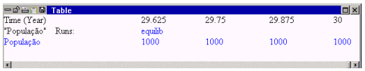 | A variável População é representada por uma linha azul horizontal no topo do gráfico na altura dos 1000 coelhos. Para verificar numericamente o ccomportamento de População, dê um clique na ferramenta Table (tabela). Uma janela mostra que a População se mantém inalterada em 1000 coelhos. Role pela janela para ver os valores durante os 30 anos.