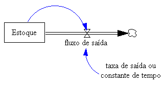 Quando falamos de taxa de saída, queremos dizer que o sistema apresenta um fator, que multiplicado pelo estoque, nos dará o valor do fluxo de saída. Por exemplo: se dissermos que um determinado estoque está diminuindo na base de 20%, isso significa que a taxa de saída será 0.2, logo: fluxo de saída = Estoque * taxa de saída Em outros exemplos, vimos o conceito de constante de tempo. Podemos citar, como exemplo, tempo médio de vida de uma população. Nesse caso, o fluxo de saída é o resultado da divisão do estoque por essa constante de tempo. fluxo de saída = Estoque / constante de tempomortes = População / tempo médio de vida |