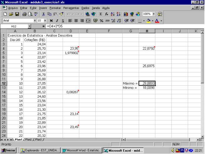 | A determinação dos limites máximo e mínimo para verificação da existência de pontos discrepantes não é feita de forma "automática" pelo Excel, sendo necessário utilizar as fórmulas já indicadas anteriormente. A seguir serão apresentadas as duas estratégias de diagnóstico de pontos discrepantes. Primeiramente, considerando o triplo do desvio-padrão (células H12 e H13) e, em seguida, a abordagem de 3/2 do intervalo interquartílico(células H17 e H18). Na primeira situação, depois de posicionar o cursor na célula selecionada, digitar =D4+3*D5 (para o limite máximo, observando que nas células D4 e D5 encontram-se a média e o desvio-padrão, respectivamente, e digitar =D4-3*D5 (para o limite mínimo).