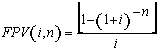 A equação (4) revela que o valor presente (PV) de uma SUP pode ser obtido mediante a multiplicação do termo da série (PMT) por um fator de valor presente, calculado para uma taxa “i “ e um número de parcelas “n”, empregando-se as equações (7) ou (8). |