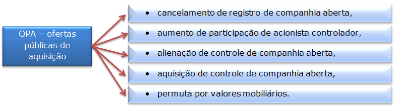 | 1. Ofertas públicas de aquisição de ações (OPA) Neste momento do curso teremos a oportunidade de examinar aspectos operacionais relacionados às ofertas de valores mobiliários. De forma mais específica, iniciaremos com o exame da questão das ofertas públicas de aquisição de ações de companhias abertas, momento em que um agente econômico, de forma pública, anuncia ao mercado o desejo de adquirir ações de uma companhia com esses títulos negociados em Bolsa de Valores. A Instrução CVM nº 361, de 5 de março de 2002 dispõe sobre o procedimento aplicável às ofertas públicas de aquisição (OPA).