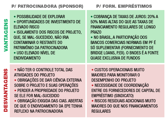 O quadro a seguir apresenta as principais vantagens e desvantagens de Project Finances, para sponsors e agentes financiadores: