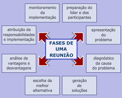 b) Fases de uma reunião Reuniões de resolução de problemas e tomada de decisão devem observar uma sequência de fases, cuidadosamente sistematizadas, numa sequência lógica. Todas as fases são importantes e complementares. Porém nem sempre essas etapas são delineadas de forma clara.