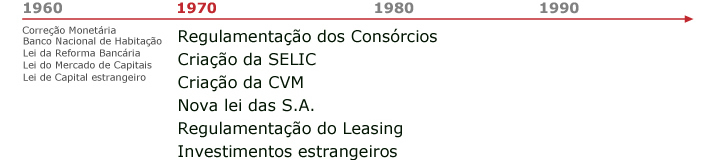 Nesse contexto, o governo militar decidiu implementar algumas ações para melhorar as condições e o reordenamento econômico e financeiro do país. Portanto, os anos 60 foram marcados por algumas inovações importantes, como a criação do instrumento da Correção Monetária, aprovação da lei da Reforma Bancária que instituía o CMN (Conselho Monetário Nacional) e o Banco Central da República do Brasil e a criação do BNH (Banco Nacional da Habitação).