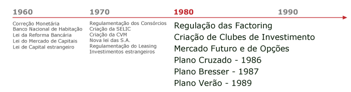 O Brasil iniciou a década de 1980 despreparado para os desafios que enfrentaria. Mesmo após dois choques do petróleo, elevação de juros internacional e contração do comércio, o final do governo militar manteve sua política de captação de recursos externos, empréstimos para financiar seus gastos e seu crescimento, solidificando de vez uma das maiores dívidas do mundo. Com a abertura política e a transmissão do governo militar para um governo civil em 1984, o país experimentou uma série de planos econômicos que visavam conter o processo inflacionário que se tornava cada vez mais agudo e prejudicava o crescimento econômico. Em relação ao mercado financeiro as principais evoluções foram a regulamentação dos mercados futuros e de opções, difusão das empresas de factoring e criação dos clubes de investimento.