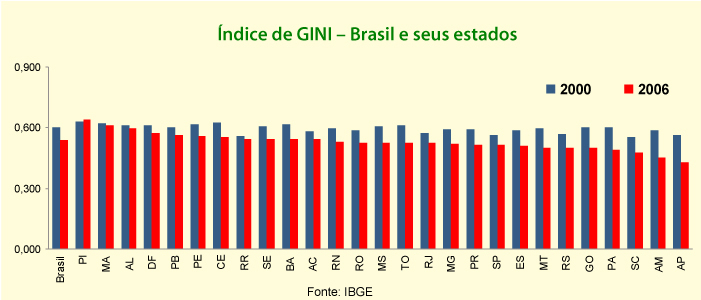 O índice de GINI é um dos indicadores mais conhecidos e utilizados pelo mercado para acompanhar esta variável. Criado pelo matemático italiano Conrado Gini, é um instrumento para medir o grau de concentração de renda em determinado grupo, apontando a diferença entre os rendimentos dos mais pobres e dos mais ricos. Varia de zero a um, sendo zero a situação de igualdade na qual todos têm a mesma renda, e o valor um é o extremo oposto. Portanto, quanto mais próximo de 1, pior a distribuição de renda.