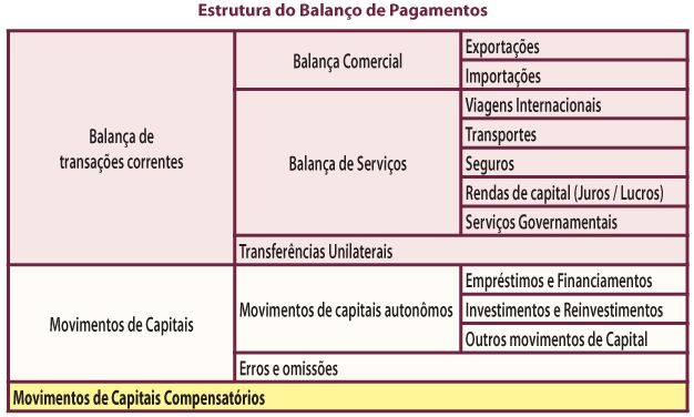 | b. Balanço de pagamentos A política cambial está muito vinculada ao desempenho da balança de pagamentos de um país, isto porque ela expressa os valores em unidades monetárias de Dólar (US$) de todas as transações internacionais efetuadas por um país, destacando-se os pagamentos pelos vários tipos de operações, realizadas entre residentes e não residentes no país, em determinado período. Mas, o que vem a ser balanço de pagamentos? Nada mais é que o confronto de receitas e despesas das contas relativas aos negócios do país. Se o saldo destes confrontos for positivo há um superávit, indicando que o volume de entradas de divisas no país foi maior que o volume de saídas. Do contrário, se o saldo for negativo, tem-se um déficit. A estrutura sintética do balanço de pagamentos é a seguinte: