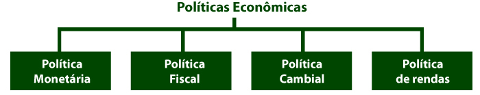 A Política Monetária pode ser definida como o conjunto de medidas para controlar o volume da liquidez (quantidade de dinheiro que circula na economia) à disposição dos agentes econômicos, ou seja, controlar a oferta da moeda e das taxas de juros de curto prazo que garantam a liquidez ideal de cada momento econômico. Sua atuação sobre os meios de pagamento, títulos públicos e taxas de juros, modifica o custo e o nível de oferta do crédito e é executada pelo Banco Central por intermédio dos diversos instrumentos à sua disposição. Já a Política Fiscal preocupa-se com o equilíbrio entre os gastos do Governo (despesas e investimentos) e a arrecadação tributária. Ocorrendo déficit (gastos superiores às receitas) no orçamento, o Governo financia suas necessidades de caixa mediante aumento de impostos, emissões monetárias e de títulos públicos, de maneira a promover o equilíbrio do orçamento. A Política Cambial é a administração da taxa de câmbio e o controle das operações cambiais. A essência dessa política é encontrar a taxa de câmbio de equilíbrio, que permita à economia crescer e promover seu desenvolvimento econômico. Por fim a