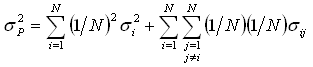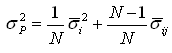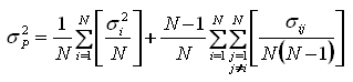 Note que ambos os termos entre colchetes são médias. O primeiro termo é a média das variâncias individuais, enquanto o segundo é a média das covariâncias. Substituindo os somatórios pela expressão das médias:
