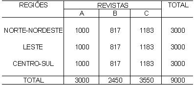 | Considere agora que podemos arbitrar um valor para preenchimento do cruzamento: revista A e região Norte-Nordeste. Qualquer número entre 0 e 3000 pode ser escolhido, uma vez que não estará ultrapassando os limites impostos pelos totais parciais (tanto total da linha como da coluna). Admita que seja escolhido o número 500 (como poderia ter sido 600, 700 ou outra opção):