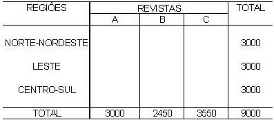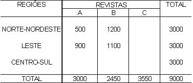 | Se pensarmos no preenchimento do cruzamento revista C e região Norte-Nordeste, é fácil constatar que só há uma possibilidade que atende corretamente à condição de 3000 leitores naquela região, a saber, o número 1300. Mais uma vez, não há "liberdade" de preenchimento para aquela célula. Para o cruzamento revista B e região Leste, por analogia com as demais situações, há diversas possibilidades numéricas que podem ser consideradas. Pode-se arbitrar,